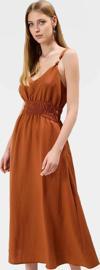 Bu nefes kesici maxi elbise, yaz aylarının sıcak günlerinde şıklığı ve konforu bir arada sunuyor. Hafif ve serinleten aerobin dokuma kumaştan üretilen elbise, vücudunuzu sararak zarif bir siluet oluşturur. Belden açılan eteği ve aksesuar detayları ile benzersiz bir tarz yakalayacaksınız. Günlük kullanım için ideal olan bu elbise, plajda, arkadaşlarınızla buluşmada veya akşam yemeğinde göz alıcı görünmenizi sağlayacak.