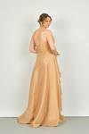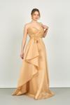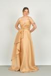 Detay: Uzun, bel kısmı işlemeli, fırfırlı, astarlı abiye elbise;