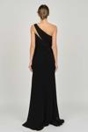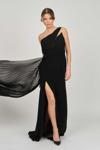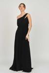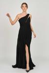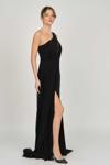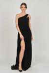 Detay: Derin yırtmaçlı, pliseli, astarlı abiye elbise;