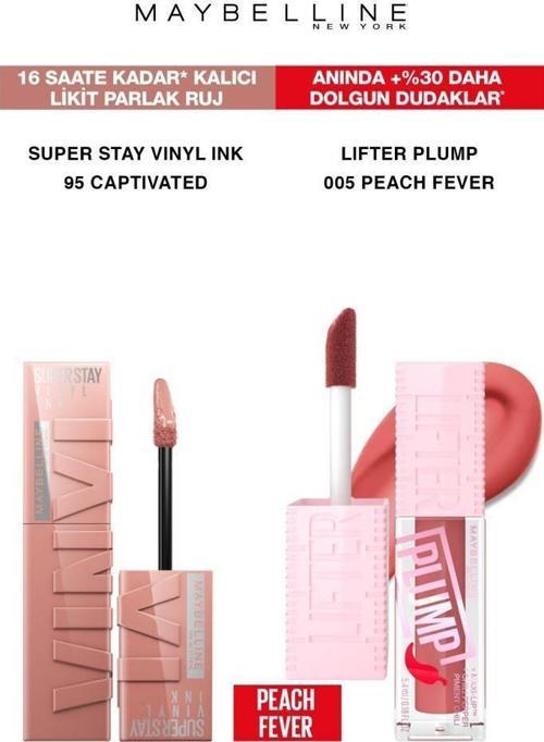 Maybelline New York Super Stay Vinyl Ink Uzun Süre Kalıcı Likit Parlak Ruj Çalkala. Sür. Hazırsın.Super Stay Vinyl Ink ailesi ile 16 saate kadar* kalıcı etki ve süper parlaklık!- Yeme, içme ve bulaşmaya dayanıklı - Yapışkan his bırakmayan formül - Kolay uygulama sağlayan fırça - Yüksek parlaklık ve kalıcılık *Kişisel değerlendirme, 109 kişiMaybelline New York Lifter Plump Dudak ParlatıcısıAnında %30 daha dolgun görünen dudaklar* için yeni Lifter Plump dudak parlatıcısı! Dudaklarda anında ve zaman içerisinde yoğun dolgunluk görünümü sağlar. Acı biber özü içeren formülü ile tek sürüşte yoğun, hızlı ve uzun süreli dolgunluk etkisi verir. Uzun süre kalıcı ve anında pürüzsüz görünen dudaklar! Yapışkan his bırakmaz, XL aplikatörü ile kolay uygulama yapılır. Ürün kullanımında geçici karıncalanma hissi olması normaldir. *Klinik çalışma,55 kişi.