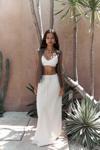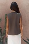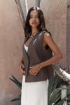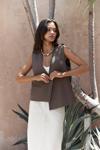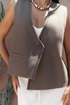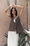 Pamuklu V kesim asimetrik tasarımlı yelek. Yalancı cep görünümlü, uyumlu nakış ip desenli.