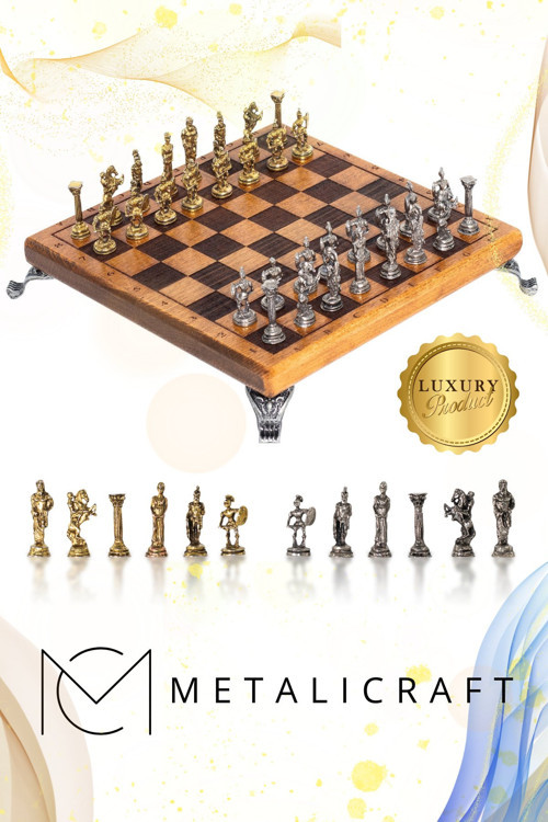 Metalicraft MC102 Satranç Takımı 25x25cm - Bizans Figürlü Metal Taşlar – Gerçek Ağaç Tahta – El Yapımı – Hediyelik