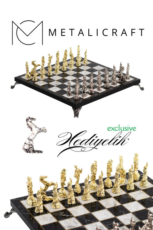 Metalicraft MC58 Uzak Doğu Figürlü Metal Satranç Takımı - Mermer Desenli 25x25 Ahşap Tahtasıyla - Lüks Hediyelik