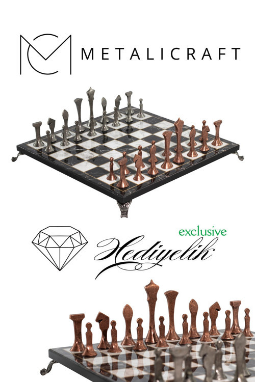 Metalicraft MC74 Metal Satranç Takımı - Mermer Desenli 30x30cm Ahşap Tahta - Büyük Boy Taş - Lüks Hediyelik