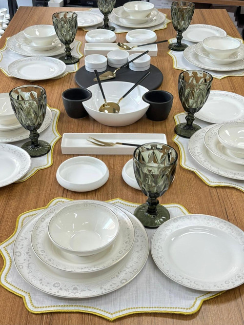 6 Adet Amerikan Servis 6 Adet Servis Tabağı 6 Adet Çukur Tabak 6 Adet Çorba Kasesi 6 Adet Pasta Tabağı 6 Adet Kadeh 4 Adet Yuvarlak Sunumluk 2 Adet Dikdörtgen Sunumluk 1 Adet (3 Parça) Kase 1 Adet (4 Parça) Yuvarlak Sunum Tabağı 5 Parça Servis Seti