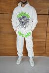 Erkek Kapüşonlu Eşofman Takım Örümcek Ağı Ve Neon Yeşil Baskılı Kanguru Cepli Oversize Rahat Kalıp, Premium Üç İplik Kumaş - Beyaz