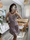 Kadın Askılı V Yaka Beli Pileli Leopar Desen Eteği Fırfırlı Süprem Elbise