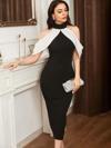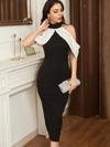 Arona MDB Kadın Daire Yakalı Omuzlardan Kollara Yayılan Kanat Detaylı çift Renkli Uzun Ithal Krep Elbise