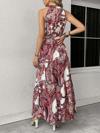 Kadın Halter Yakalı Omuzlardan Açık Kuşaklı Maksi Boy Desenli Süprem Elbise