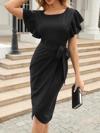 Kadın Kısa Fırfır Kollu Yakası Açık Belden Kuşaklı çapraz Kesim Detaylı Ithal Krep Elbise