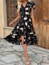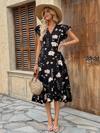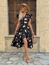 Kadın Kısa Kelebek Kollu Kruvaze Yakalı Belden Kuşaklı Midi Süprem Elbise