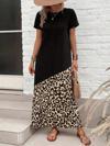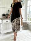 Kadın Kısa Kollu Bisiklet Yaka Leopar Detaylı Midi üst Viskon Alt Süprem Elbise
