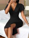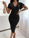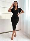 Kadın Kısa Kollu Derin Dekolte V Yakalı Yırtmaçlı Midi Janjan Krep Elbise
