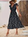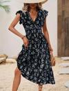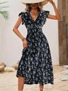 Kadın Kısa Kollu Kruvaze Yakalı Beli Lastikli çiçek Desenli Elbise
