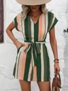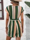 Kadın Kısa Kollu V Yakalı Beli Kuşaklı Keten Tulum