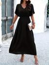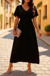 Kadın Kısa Kollu V Yakalı Beli Lastikli Uzun Viskon Elbise
