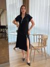 Kadın Kısa Kollu Yakadan Ve Etekten Fermuarlı Midi Viskon Iki Iplik Elbise