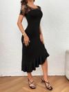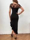 Kadın Kısa Kollu Yakası Açık Dantel Detaylı Fırfırlı Asimetrik Janjan Krep Elbise