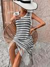 Kadın Kolsuz V Yaka Eteği Püsküllü çizgi Desen Triko Elbise