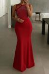 Kadın Omuz çoklu Askılı önü Taş Işlemeli Balık Kesim Janjan Krep Maxi Boy Elbise