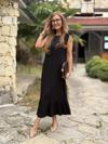 Kadın Omuzlardan Büzgülü Kayık Yaka Fırfırlı Janjan Krep Elbise
