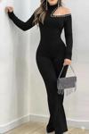 Kadın Tek Omuzdan Açık Balıkçı Yaka Taş Detaylı Uzun Ithal Krep Tulum