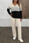 Kadın Uzun Kollu Kapşonlu Bağcıklı Blok Renkli şardonlu Kaşkorse Bluz Ve Pantolon Ikili Takım