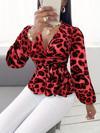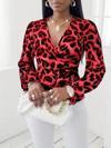 Kadın Uzun Kollu Kruvaze Yakalı Belden Kuşaklı Leopar Desenli Süprem Bluz