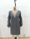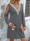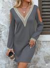 Kadın Uzun Kollu Omuzdan Açık V Dantel Yakalı Mini Waffle Elbise