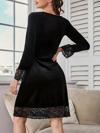 Kadın Uzun Kollu V Dantel Yakalı Mini Kadife Elbise