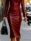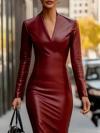 Kadın Uzun Kollu V Yakalı Deri Midi Elbise