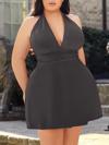 Boyundan bağlamalı tasarımıyla zarif bir dekolte sunarken, mini kesimiyle feminenliğinizi ön plana çıkarır. Antrasit rengin asil ve modern havası, büyük beden uyumlu kesimiyle birleşerek hem rahat hem çekici bir siluet yaratır.