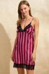 Saten Çizgili İp Askılı Dantelli Kısa Gecelik