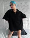 Unisex Yarım Fermuarlı Düz Oversize T-Shirt - Siyah
