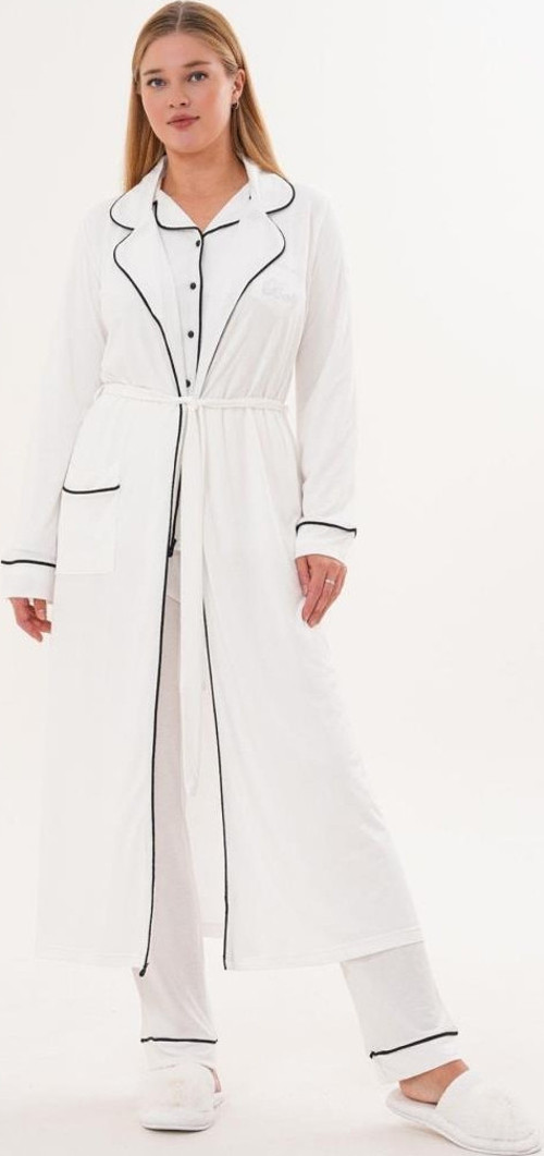 | Mecit 6333 ekru kadın sabahlık ve pijama takımı, gün boyu konfor sunan zarif bir modeldir. Pamuklu viskon kumaşı sayesinde cilde yumuşak dokunuş sağlar, hafif yapısıyla rahat hareket etmeni destekler. Boydan düğmeli pijama üstü modern bir görünüm yaratırken, sabahlık biye detaylarıyla takıma zarif bir hava katar. |