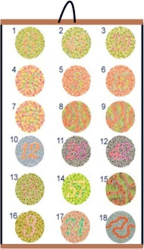 Renk Körlüğü Test Skalası Özellikleri; Duvara askı aparatı ile birlikte gönderilir. Vinleks malzemeden üretilmiştir. Ebatlar; En; 29CM Boy; 70CM Renk Körlüğü nedir? Renk körlüğü, kadınlardan fazla erkeklerde görülen, oldukça yaygın bir durumdur. Renkleri ayırt etme yeteneğinin bozukluğudur. En fazla görülen tipi, kırmızı ile yeşilin ayırt edilememesidir. Ender görülen bazı vakalarda ise bütün renklerin ayırt edilememesi ve dünyanın siyah – beyaz görülmesi söz konusudur. Her 20 erkekten ve her 200 kadından birinde vardır. Renk Körlüğü çeşitleri; Kırmızı renge duyarlı olan koni hücreleri yok ise (Protonopia) kırmızı renk körlüğü, Mavi renge duyarlı koni hücreleri yok ise, (mavi renk körlüğü), Yeşil renge duyarlı koni hücreleri yok ise, (Deuteranopia) yeşil renk körlüğü, Kırmızı rengi ayırt eden koni hücresinin olmadığı bir durum olan protonopia renk körlüğünde sadece koyu kırmızı renk algılanmayacaktır. Kişinin gördüğü renkler koni hücreleri durumu ile ilgili olarak yeşil, mavi ve bu iki rengin karışımıyla görülen renkler olacaktır. Yeşil ayrımı yapan yeşile duyarlı konilerin bulunmadığı deuteronopia renk körlüğü durumunda ise, yalnızca kırmızı ve mavi renkler ile bunların karışımı görülecek. Yeşil renkler ayırt edilemeyecektir. Yalnızca tek renk konisinin mevcut olduğu durumlarda , diğer iki renk koni sinin olmadığı renk görme sorununa monokromatik renk körlüğü denmektedir.Örnek verecek olursak sadece mavi rengi algılayan mavi renk konilerinin mevcut olduğu bir durumda, kırmızı ve yeşil renk konilerinin bulunmadığı durumlarda kişi yeşil ve kırmızı renkleri ayırt edemeyecektir. Monokromatik renk körleri sadece mavi ve sarı renkleri tanımlayabildiğinden, bu durum kırmızı-yeşil renk körlüğü olarak adlandırılabilir.
