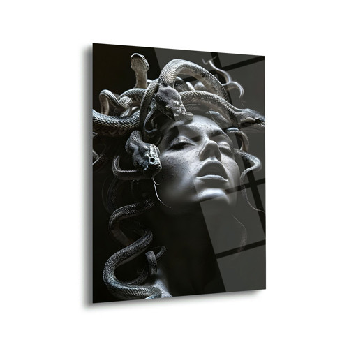 Gizemli atmosferi ve çarpıcı görsel etkisiyle tasarlanan bu özel Medusa portre temalı cam tablo, modern dekorasyona sanatsal, karanlık ve etkileyici bir dokunuş kazandırır.