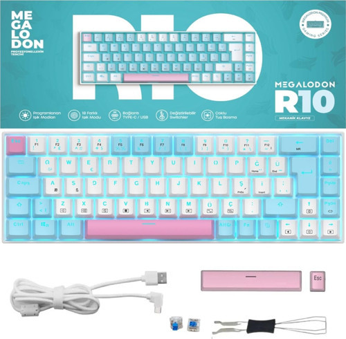 Megalodon R10 Mekanik Klavye Full Anti-Ghosting Hot Swap Blue Switch Oyuncu Klavyesi (Türkçe) Buz Mavisi Işık