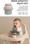 Her bir parça kolayca üst üste dizilerek kule formuna dönüşebilir, bu sayede bebekler kendi kulelerini inşa ederken hem eğlenir hem de öğrenir.