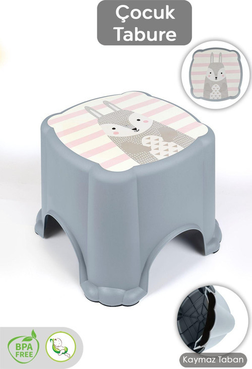 Kaydırmaz Tabanlı Çocuk Taburesi - Figürlü Banyo Lavabo Yükseltici Tabure - Gri
