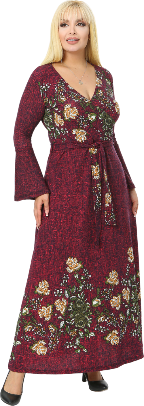 Melsay Butik Bordo Kruvaze Yaka Çiçek Desen Kadın Krep Uzun Elbise