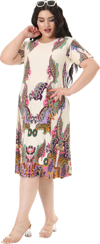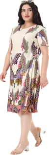Melsay Butik Ekru Şal Desen Kısa Kollu Büyük Beden Midi Elbise