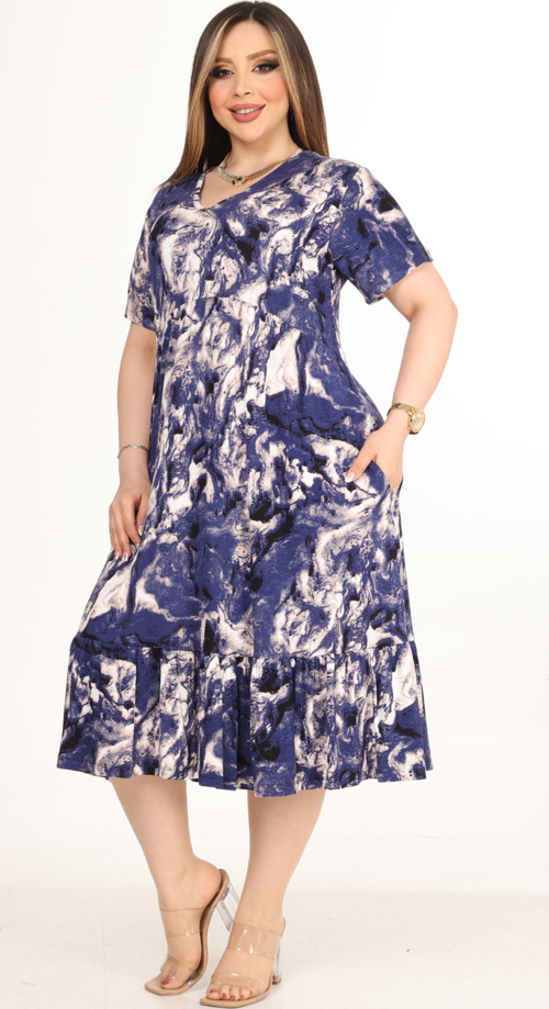 Melsay Butik Göğüsten Robalı V Yaka Kısa Kollu Mavi Batik Desenli Cepli Elbise