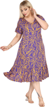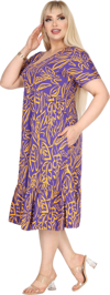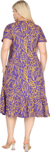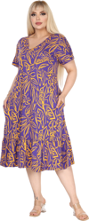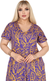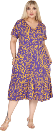 Melsay Butik Göğüsten Robalı V Yaka Kısa Kollu Mor Yaprak Desen Cepli Elbise