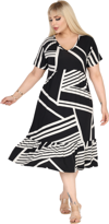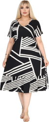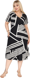 Melsay Butik Göğüsten Robalı V Yaka Kısa Kollu Siyah Çizgili Desen Cepli Elbise
