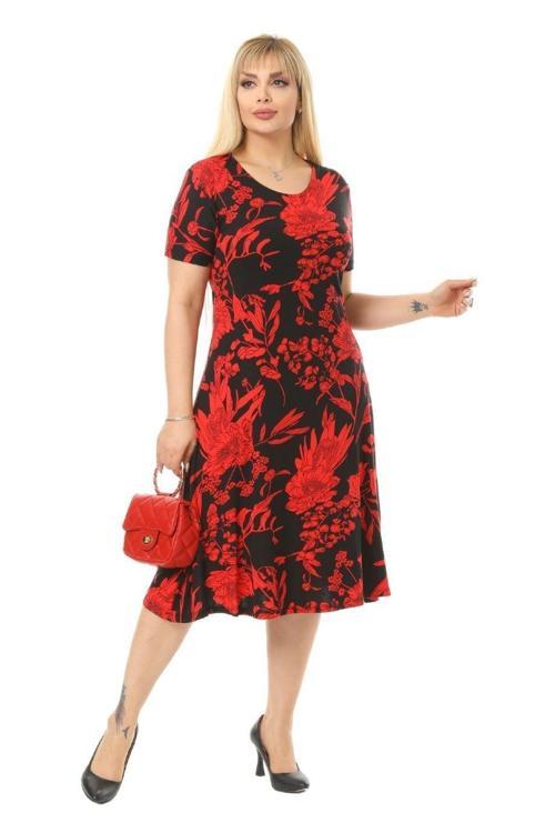 Melsay Butik Kırmızı Palmiye Desen Kısa Kollu Büyük Beden Midi Elbise