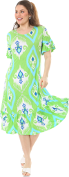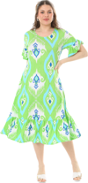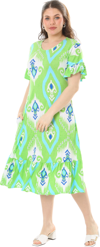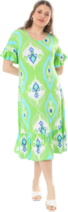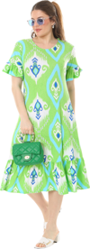 Melsay Butik Kısa Kollu Fırfırlı Cepli Yeşil Motif Desenli Midi Elbise