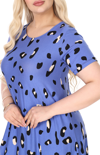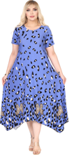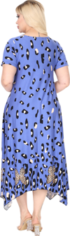 Melsay Butik Mavi Sulu Leopar Desen Asimetrik Kısa Kollu Elbise