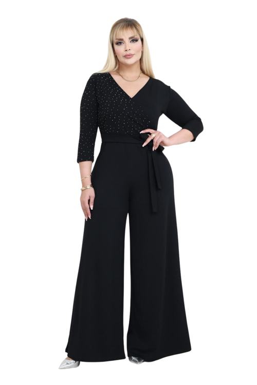 Melsay Butik Modal Kruvaze Yaka Siyah Taş Baskılı Büyük Beden Tulum