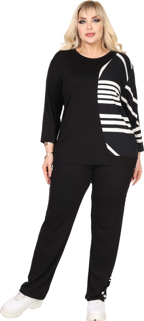 Melsay Butik Siyah Truvakar Kol Yarım Çizgi Garnili Viskon Büyük Beden Takım